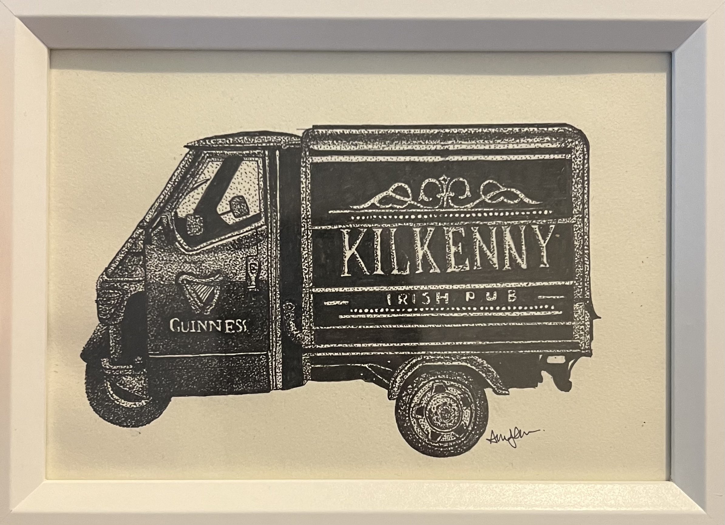 Image 1 of 2 Image 2 of 2 Kilkenny three wheeler truck $200.00 I took a photo of this truck in Budapest and had to draw it! Black ink on paper, framed Add To Cart Added! I took a photo of this truck in Budapest and had to draw it! Black ink on paper, framed
